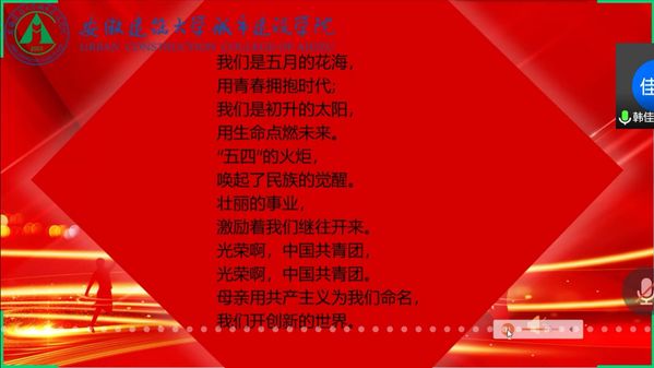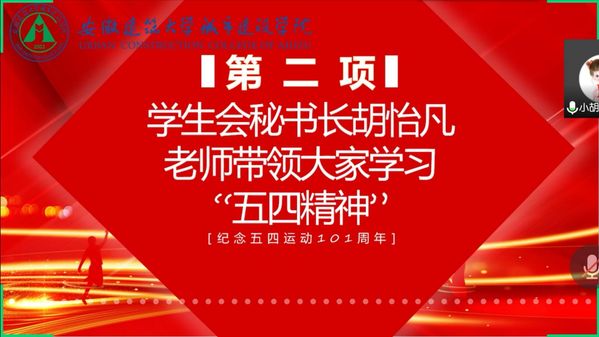 接下来,全体人员在胡怡凡的带领下学习“五四精神”。从五四青年的舍身取义延伸到脱贫攻坚的主战场,乡村振兴的新征程,再到如今的新冠肺炎疫情防控的总体战中。在这百年历史横流中,变的是一代代为祖国前仆后继的青年人,不变的是他们永存的“忧国忧民、热爱祖国、积极创新、探索科学”的五四精神!老师不仅对青年一代表示了肯定和祝愿,也表达了对青年一代寄予的厚望以及对城建学子的勉励。接着由学生代表张佳帅、罗辰辰、李想、左笑菡分享“五四精神”的感受,通过在疫情期间的亲身体验,他们认识、学习并弘扬五四精神,在家国危难之际体现了青年一代应有的责任与担当。