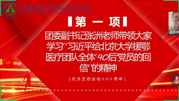 5月4日上午九点,参加活动的全体人员进入腾讯会议签到。活动伴着主持人激情洋溢的声音正式拉开帷幕,他在讲述五四运动的历史时,同学们仿佛听见那激越高昂的呼声穿越101年的时光隧道正清晰的响在耳畔。会议首先由张洲带领大家学习“习近平给北京大学援鄂医疗团队全体90后党员的回信”的精神。他表示,在青年一代灿烂的青春之路上,应当用自己的行动塑造未来的模样。希望青年一代常怀感恩情,勇于接过前人手里的接力棒,担起促进国家发展的重任。他希望广大城建学子应建立起强烈的责任心与使命感,肩负起国家复兴的大任,将“服务人民,奉献社会”作为自己一生的追求。
