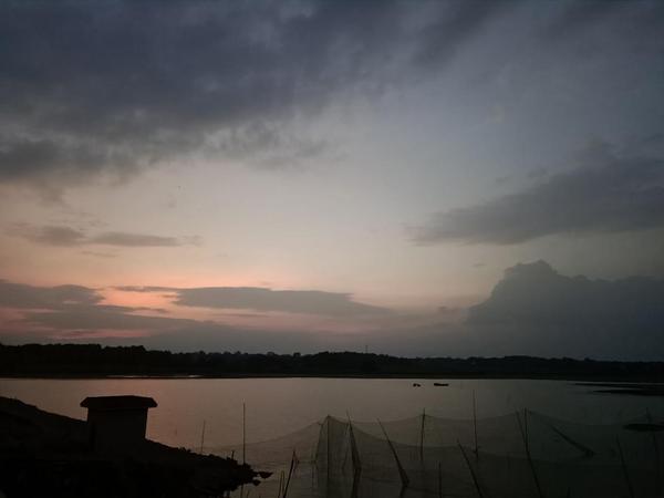 转眼间,太阳收敛起剌眼的光芒,变成一个金灿灿的光盘。天空的白云像是被染了色似的,逆着光,只看见那云儿与晚霞交叠在一起,慢慢地,颜色越来越浓,与湖水交相辉映,远处巍峨的山峦,山峦下的湖水,在夕阳映照下,涂上了一层金黄色,显得格外瑰丽。