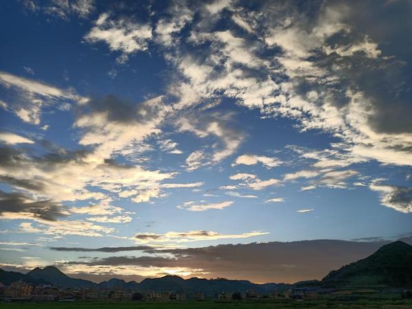 傍晚,湛蓝的天空,大片大片的云朵,太阳的光芒被厚厚的云层遮住了大半,只在云层的缝隙中,露出金色的光芒,与碧绿的草地和起伏的山峦辉映在一起,颇有“天苍苍野茫茫”之感。