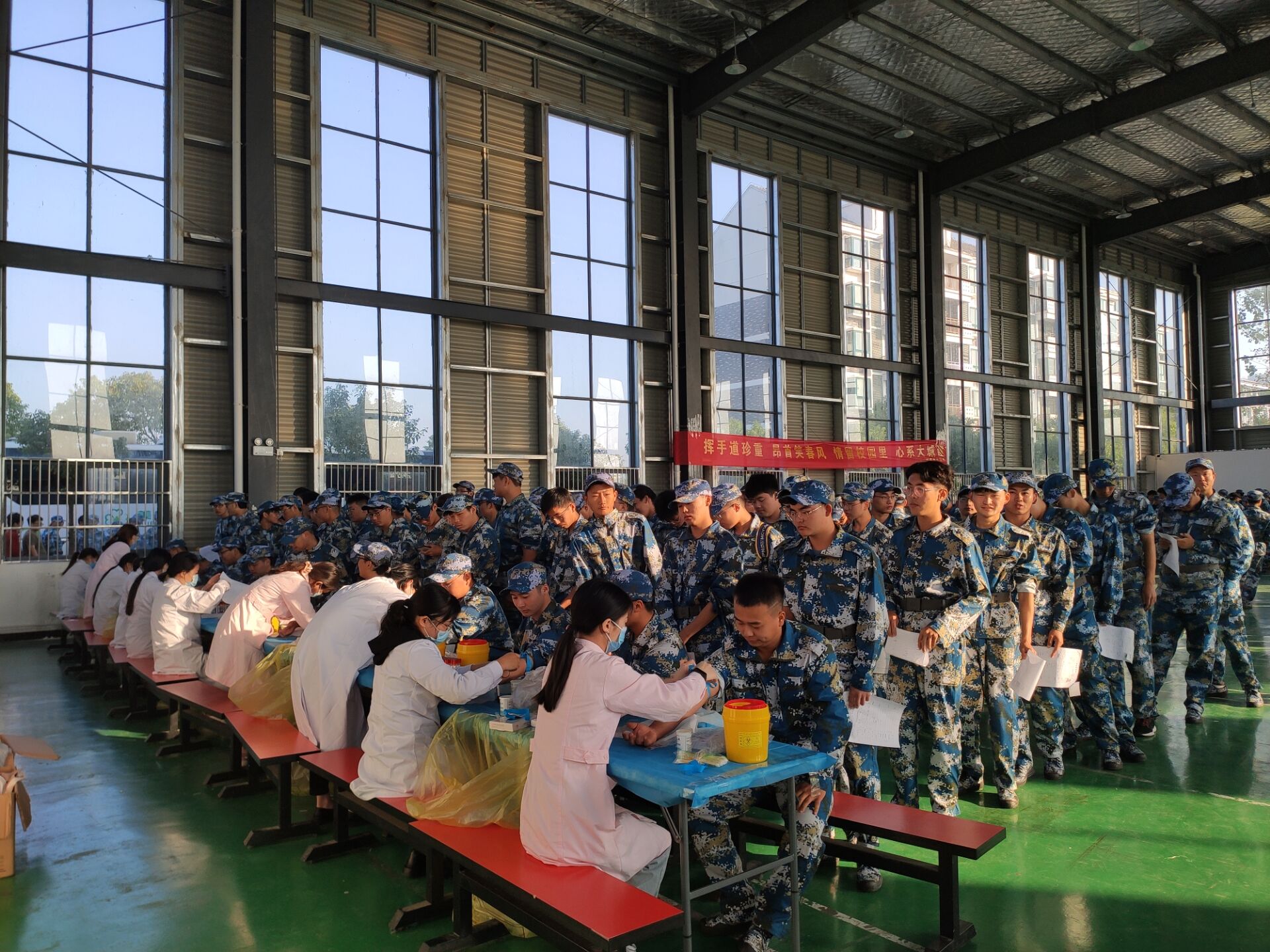 军训开始的时候,除了日常的基础训练之外,还有一件比较重要的事情就是军训体检了,这种体检类似于高考前的体检,自然也是极为壮观与恐怖的。早上八点的时候,一大拨饥肠辘辘的蓝衣大军便在操场集合,蔚蓝色的一片接着一片,远远望去,蔚然浩漾。