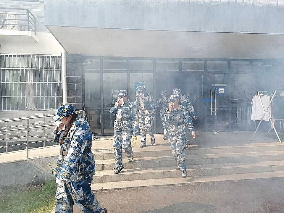 在城建的军训过程中,除了必不可少专业训练之外,还有极具教育意义的火灾消防演练。在十月十九日下午两点一十分,在城建全体新生宿舍楼下响起长哨声,伴随嘹亮的长哨声,全体新生首先按照规范进行室内躲避。一分钟之后的两点十一分,全体新生在教官认真的短哨声和用心布置的烟雾效果之下进行有序撤退,并按时到达训练场进行训练。