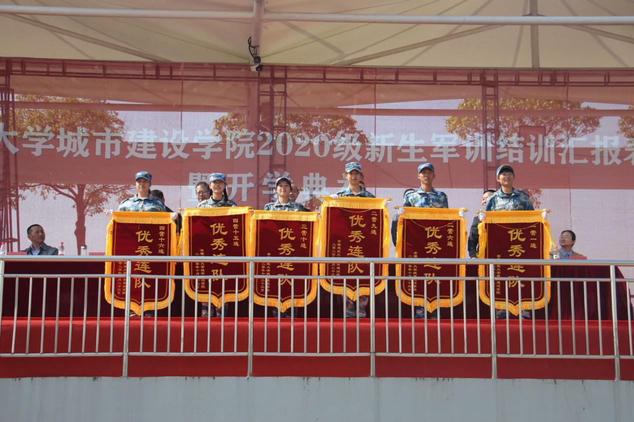 表彰大会上,主持人宣读了《关于表彰城建学院2020级学生军训先进集体和先进个人,优秀教官的决定》,校领导及嘉宾为教官颁奖,并授予2020级军训优秀集体锦旗。