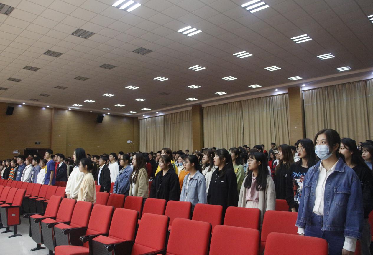 会议的第一项奏唱国歌。参加会议的全体师生一齐站立,面向国旗奏唱国歌。在整个过程中,全场氛围严肃认真。