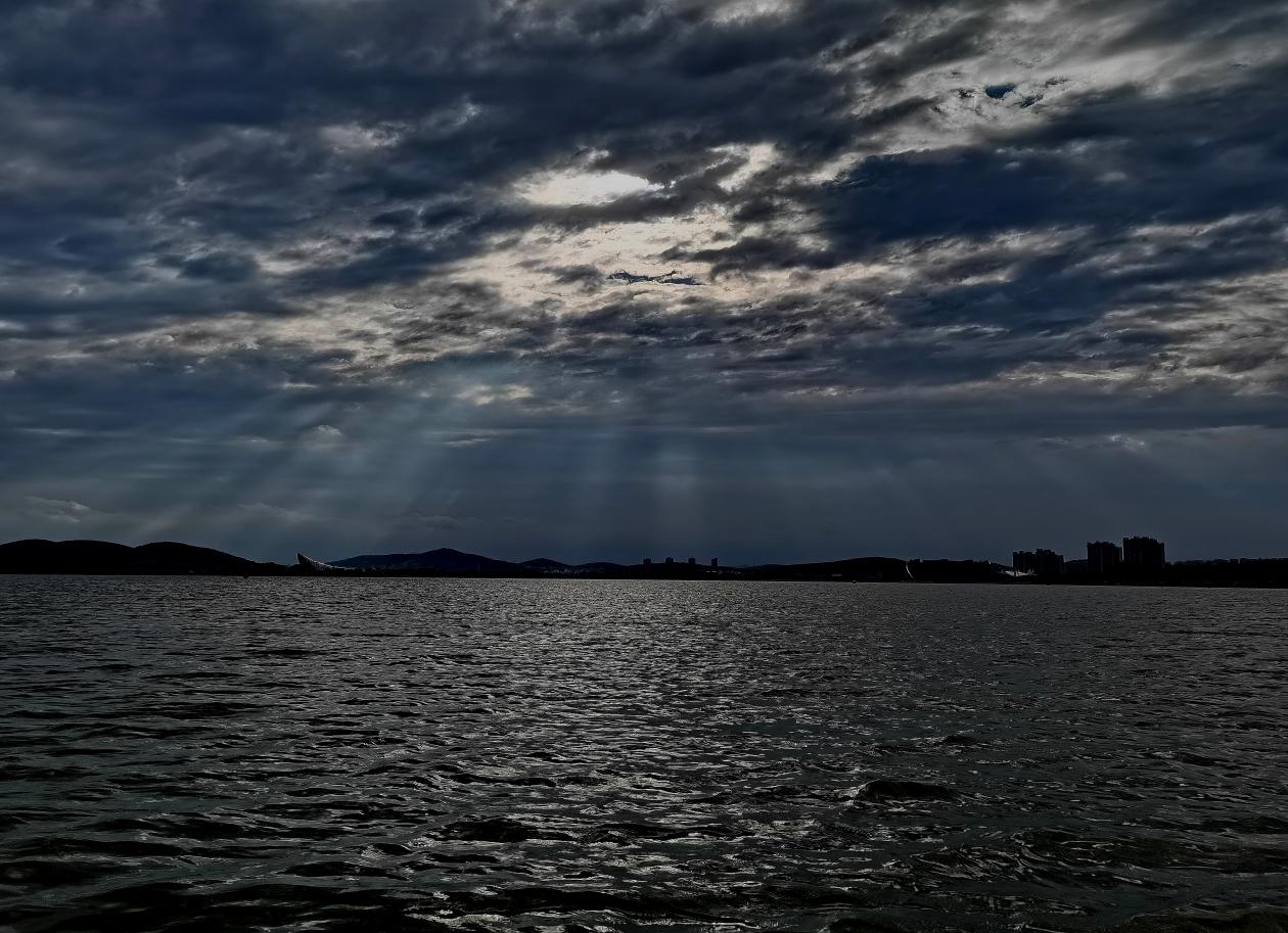 暖洋洋的阳光透过云彩洒落在湖面,光影斑驳。