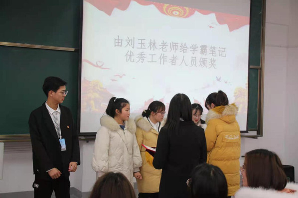 大会进行到第三项,由学科部执行部长王梓璇宣读学霸笔记优秀工作者人员名单,并由刘玉林老师为他们颁奖。