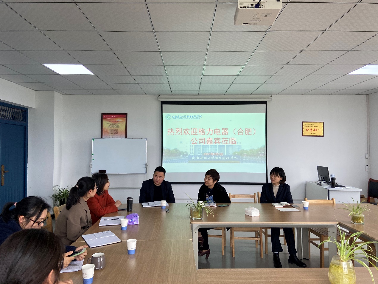 2021年4月1日下午格力电器(合肥)有限公司总经办招聘培训科负责人李培、招聘经理左俊及招聘经理余敏一行到土木工程系洽谈校企实践基地更深一步的合作,土木工程系主任邵艳、环能与安全教研室副主任韩娜丽老师及环能专业徐娟老师、胡丽丽老师、贺瑞凤老师参加了此次会议。