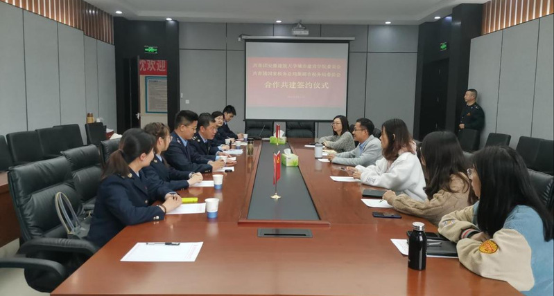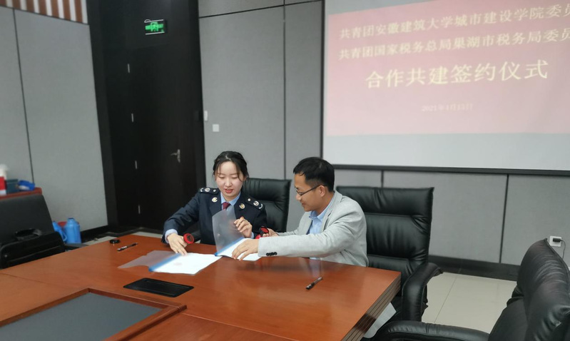 2021年4月15日下午,我院团委与共青团国家税务总局巢湖市税务局委员会在黄麓校区举行了双方合作共建洽谈会及签约仪式,会议由院团委书记林岳主持,土木系团总支书记吴紫珺、机电系团总支书记琚慧、建艺系团总支书记伍红平、管理系团总支书记刘玉林等出席签约仪式。