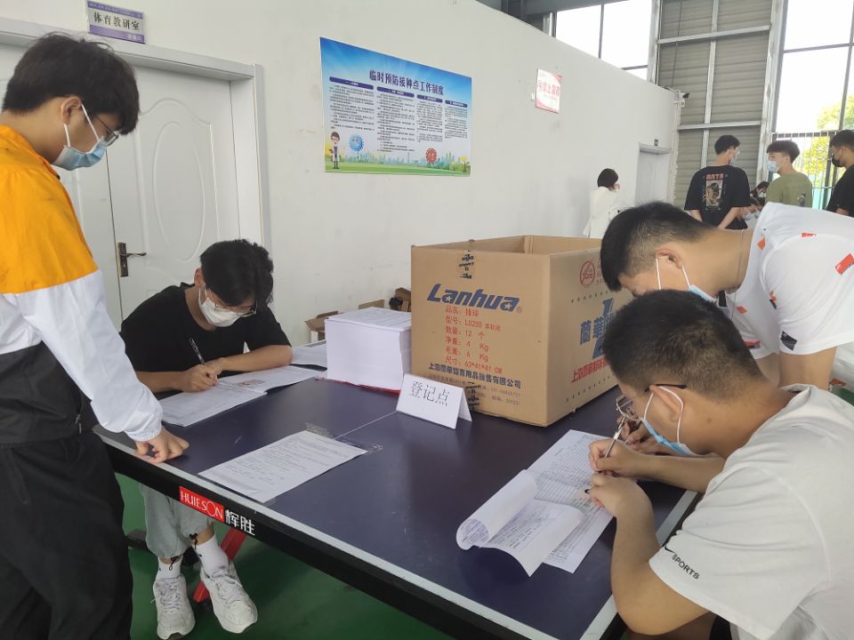 早上8点,风雨操场开始陆陆续续聚满了学生,领取并填写《新冠疫苗接种知情同意书》,工作人员核对后就可以开始排队录入身份证信息并验证疫苗接种信息,就可以在接种点接种疫苗了。