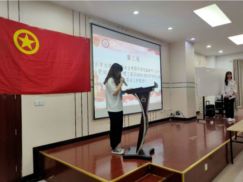 会议伊始,全体师生起立,共唱共青团团歌。随后学生组织全委会执行主席张雅捷作《关于星空在线注册(中国)官方网站-注册登录管理工程系2020-2021学年学生组织全委会工作报告》,学生代表表决通过。