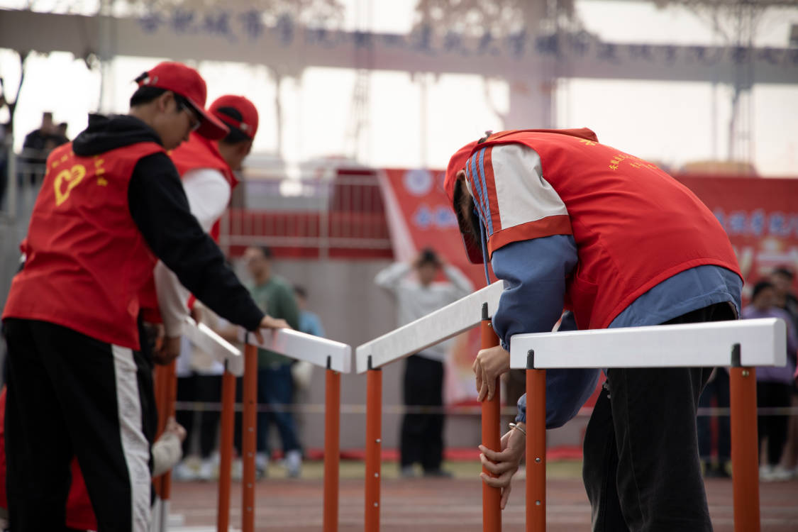 从看台望向绿茵赛场,检录处,选手们井然有序的排着队等待着志愿者们为自己进行项目检录。起点处,选手们经过志愿者们的赛前点名,一排排的静静等候着比赛的来临。终点处,志愿者们目不转睛的盯着秒表,渴求更准确的记录下一次次神圣的时刻。检录、发令、点名、搬运、记录......在这一切次序井然的背后,是无数个身披红色马甲的志愿者忙碌奔波的身影。看台上,观众们为赛场上拼搏的选手们拼命的呐喊助威,声音此起彼伏,连绵不绝,场面嘈杂,但却令人热血沸腾。而在红色塑胶跑道上,在柔软的沙坑前,在跳高的助跑道里,这些呐喊助威声汇集到了运动健儿们的耳朵里,驱散了他们的焦虑、顾忌、怀疑。有如神助般,向着最终的冠军发起冲锋。