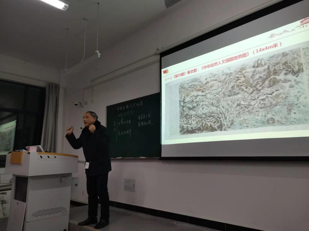 主讲人孙玉清老师,四十年匠心独运,妙手绘就人类命运共同体诗画7200米长卷,蕴涵三个层面共同体意识:一、中华民族命运共同体;二是各个国家命运共同体;三是人类命运共同体。整个画卷寓意中华民族伟大复兴历程虽艰难险阻,终势不可挡。东方文化复兴,携手西方文化,东西文明深度融合,共同促进人类文明更好发展,天下一家的共同体理念。孙老师以诗说图解方式讲解人类命运理念,深深震撼了同学们的心灵,引发学生强烈共鸣。