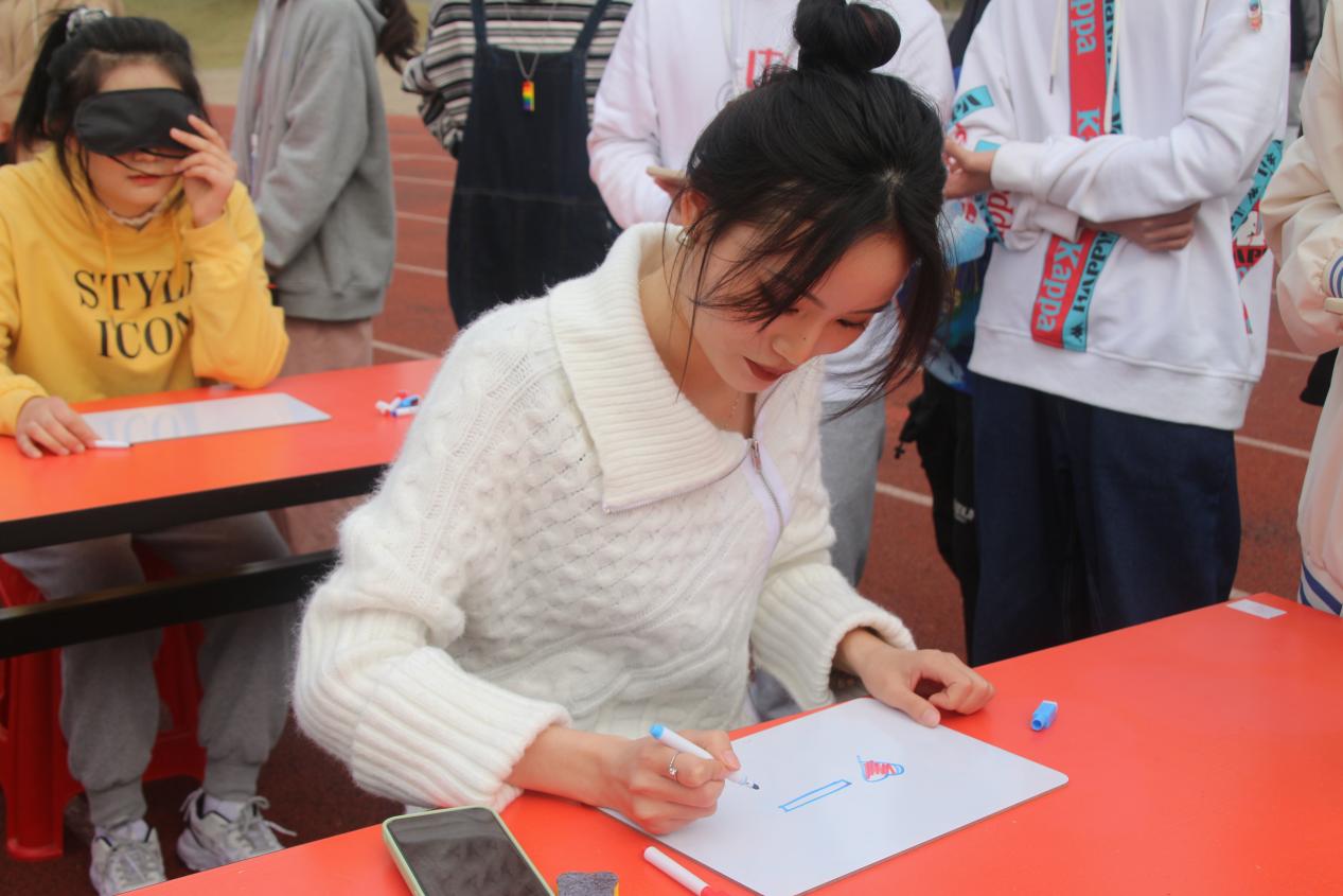 如果说“你比我猜”仅仅是通过肢体语言表达词义,那“接力传画”就更考验队员们的理解默契了。第一个人抽取题目进行作画,后面的队友通过看前一位的画作接力作画,将词语由画作表达传递给最后一位队友进行猜测。这一关涌现出许多“灵魂画手”,有词义表达准确成功过关的,也有画作传到最后会错了意的,围观同学们也是笑声阵阵,好生热闹。