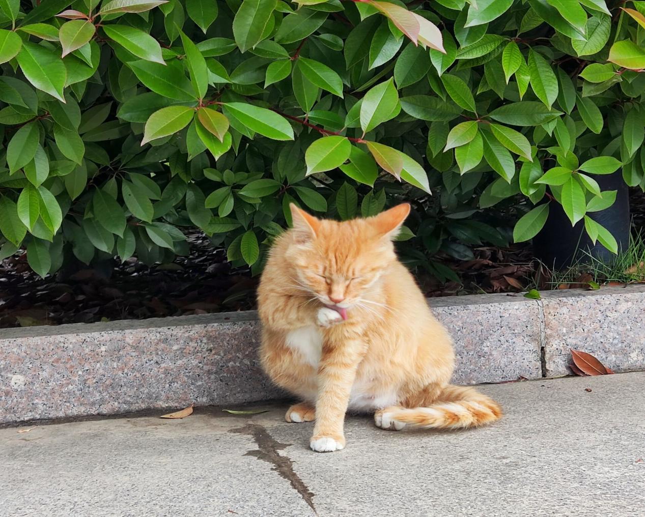 可爱的不仅是人们,还有小动物们,你看那校园里的小猫,它慵懒地卧在阳光下的草地上,橘色的毛发是那么耀眼,但又如同天使的羽翼,闪着温柔美丽的光辉,它那美丽的双眼悠闲地看着,就像一潭深湖,令人捉摸不透,却又深深的陷了进去。喵、喵、喵,曲体伸懒腰,白的像仙女,橘的一身膘。在我们拍摄时,有位校友正给猫咪喂食,他温柔的抚摸来吃食的小可爱们,小猫咪喵喵的叫着,昂起头来反蹭他的手,场面十分温馨。或许是看猫咪吃的太香,“看它吃,我都饿了”校友微笑着说。