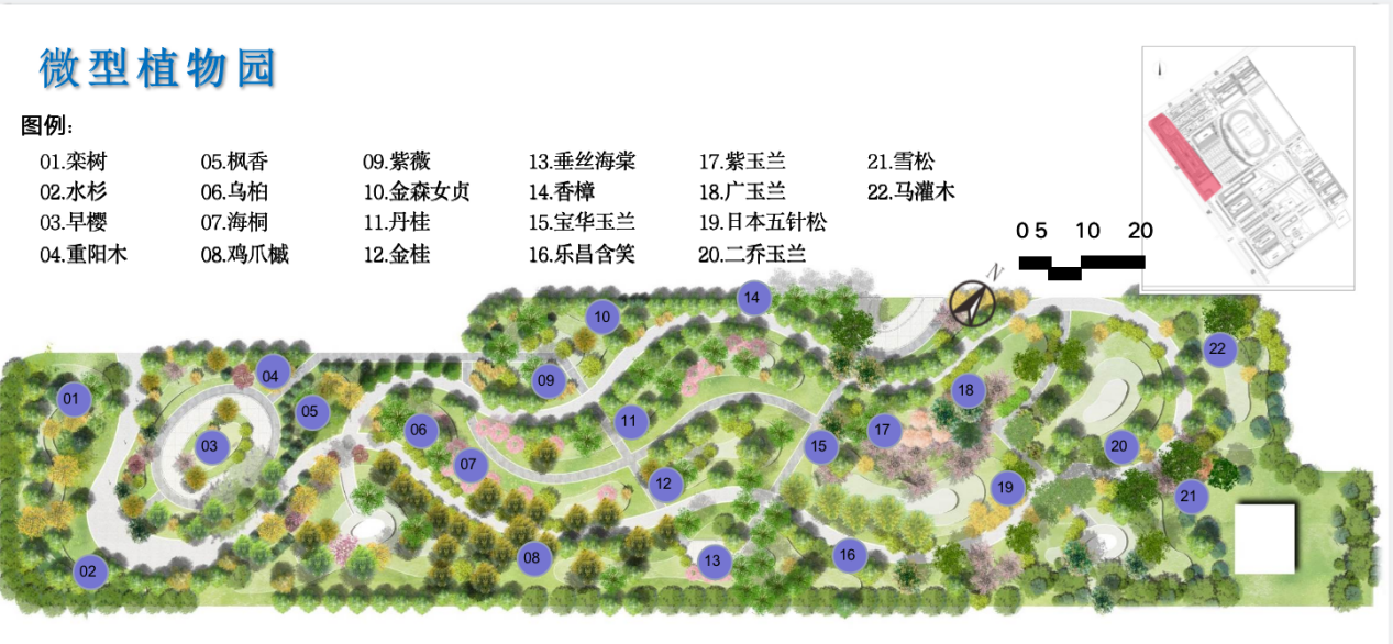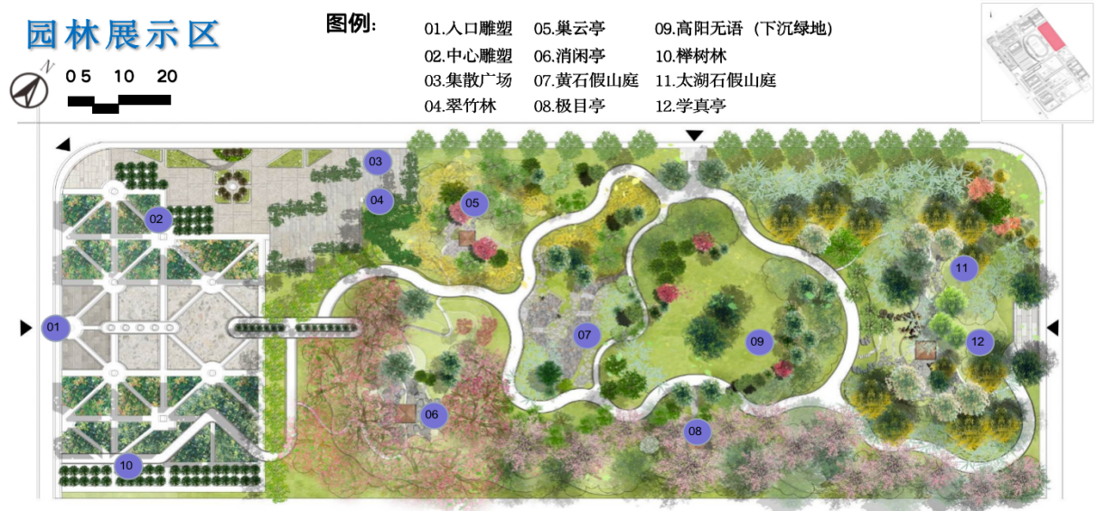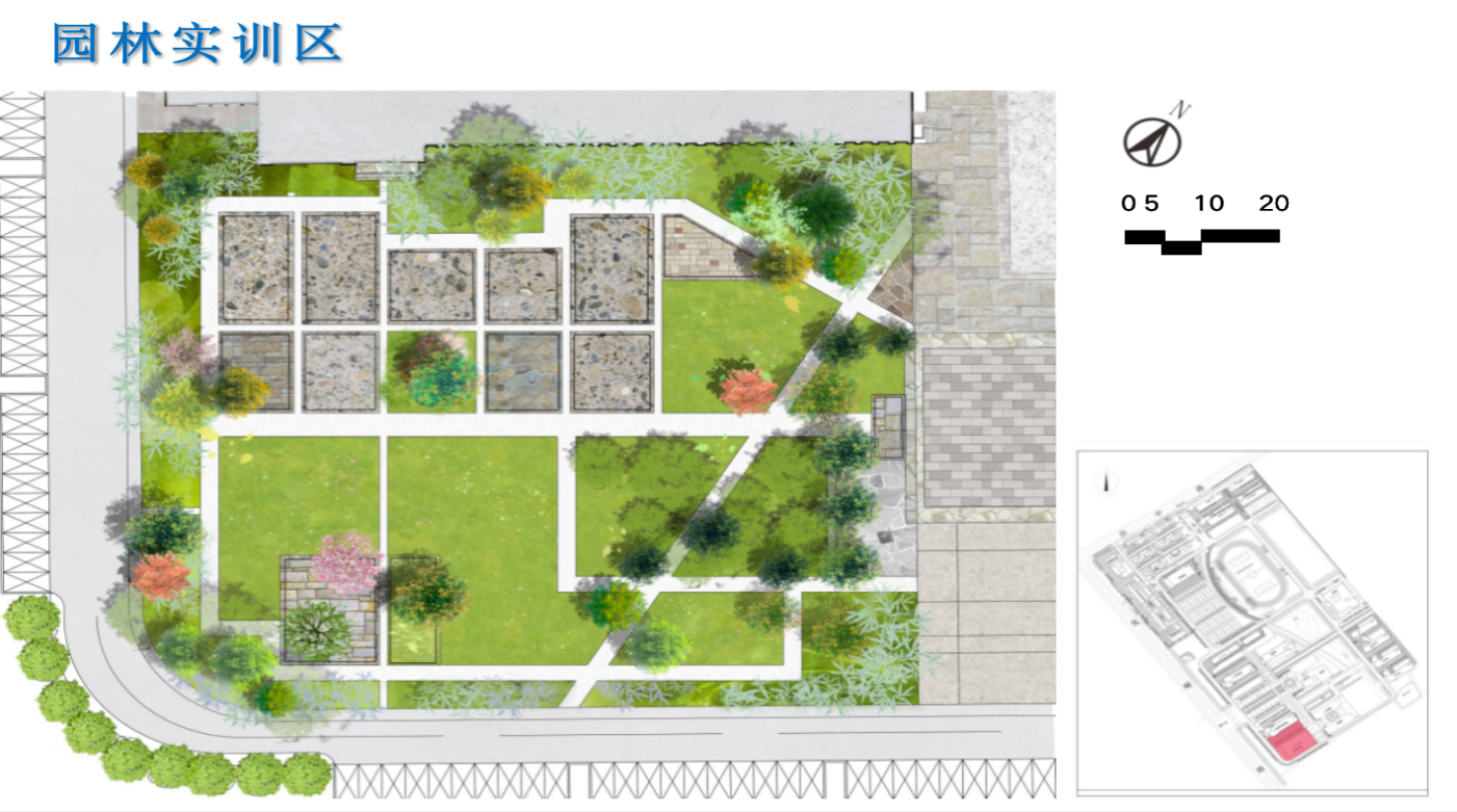 此区为风景园林展示区,结合《中外园林史》、《名园鉴赏》等相关课程内容,向学生们展示经典的园林类型,让学生直观地认识不同风格的园林景观在设计手法上的区别。
