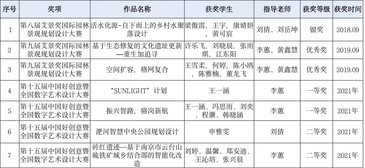 我校风景园林专业学生创新活动与实践项目共6项,在风景园林专业学生各类竞赛中获奖共计26项,其中在第八届”艾景奖“国际园林景观规划设计大赛中获得银奖 ,在第九届”艾景奖“国际园林景观规划设计大赛中获得优秀奖。