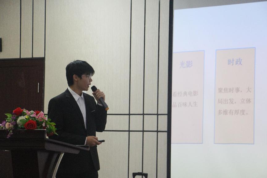 大会第一项,新闻中心新媒体、新闻中心综合行政办公室、广播台、新闻中心记者团依次进行了各部门介绍。其中广播台代表采用视频的形式向大家清晰的展现了工作内容,新颖的方式赢得现场阵阵掌声。