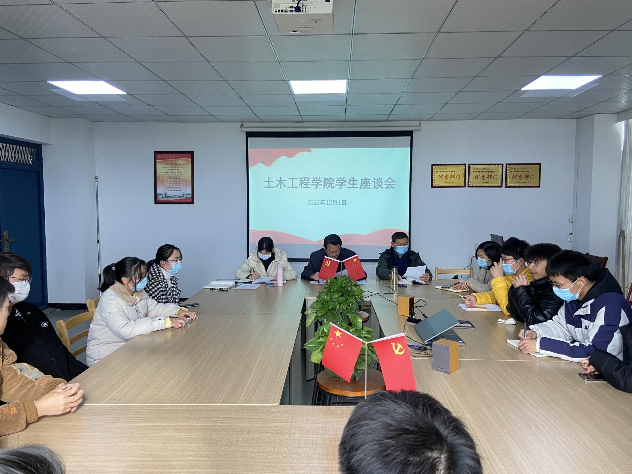 本网讯:为深入学习贯彻党的二十大精神,落实立德树人根本任务,及时倾听、深入了解同学们的学习生活状况和意见诉求,12月1日下午,校党委委员、副校长马建国与土木学院30名学生代表面对面畅谈交流。土木工程学院有关负责人及学生处有关负责人参加座谈会。