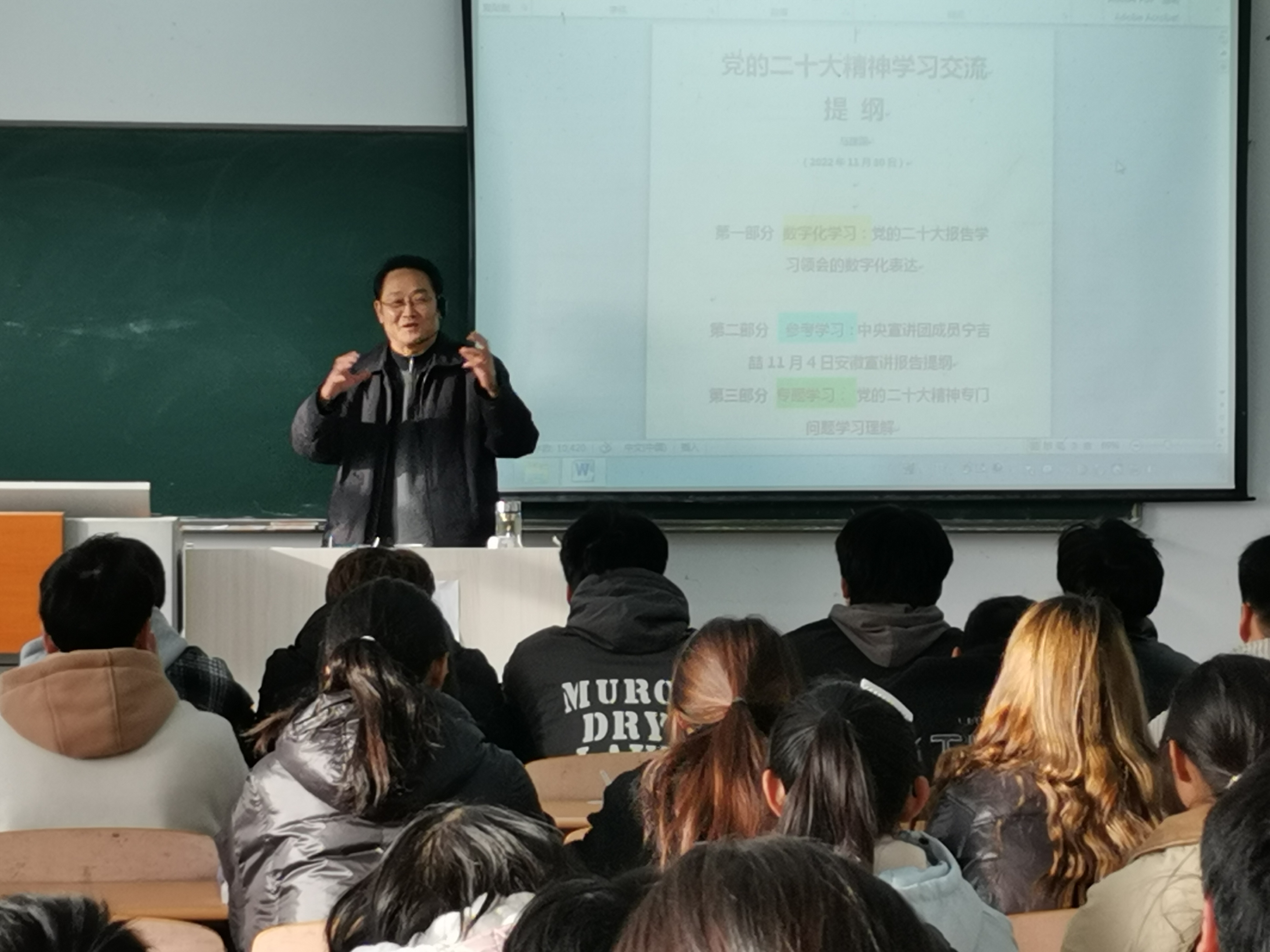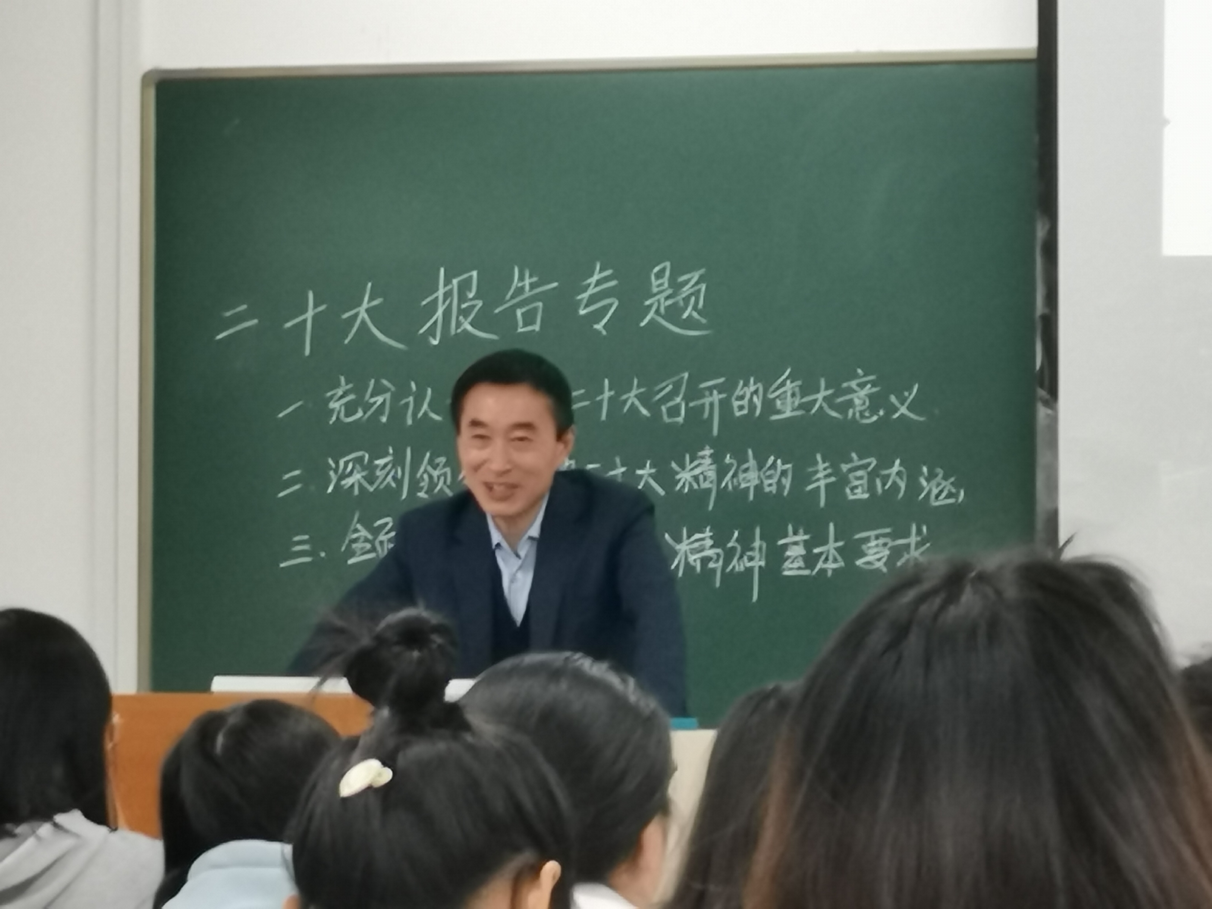 成祖德以《深学细悟二十大 踔厉奋发新征程》为题,分别从充分认识党的二十大召开的重大意义、深刻领会党的二十大精神的丰富内涵、全面贯彻党的二十大精神的基本要求三个方面展开,具体包括党的二十大主题、十年来经历了具有重大意义的三件大事、如何继续推进实践基础上的理论创新、从现在起中国共产党的中心任务、中国式现代化的本质要求,通过理论联系实际的讲解,同学们纷纷表示受益匪浅,课堂多次响起热烈的掌声。