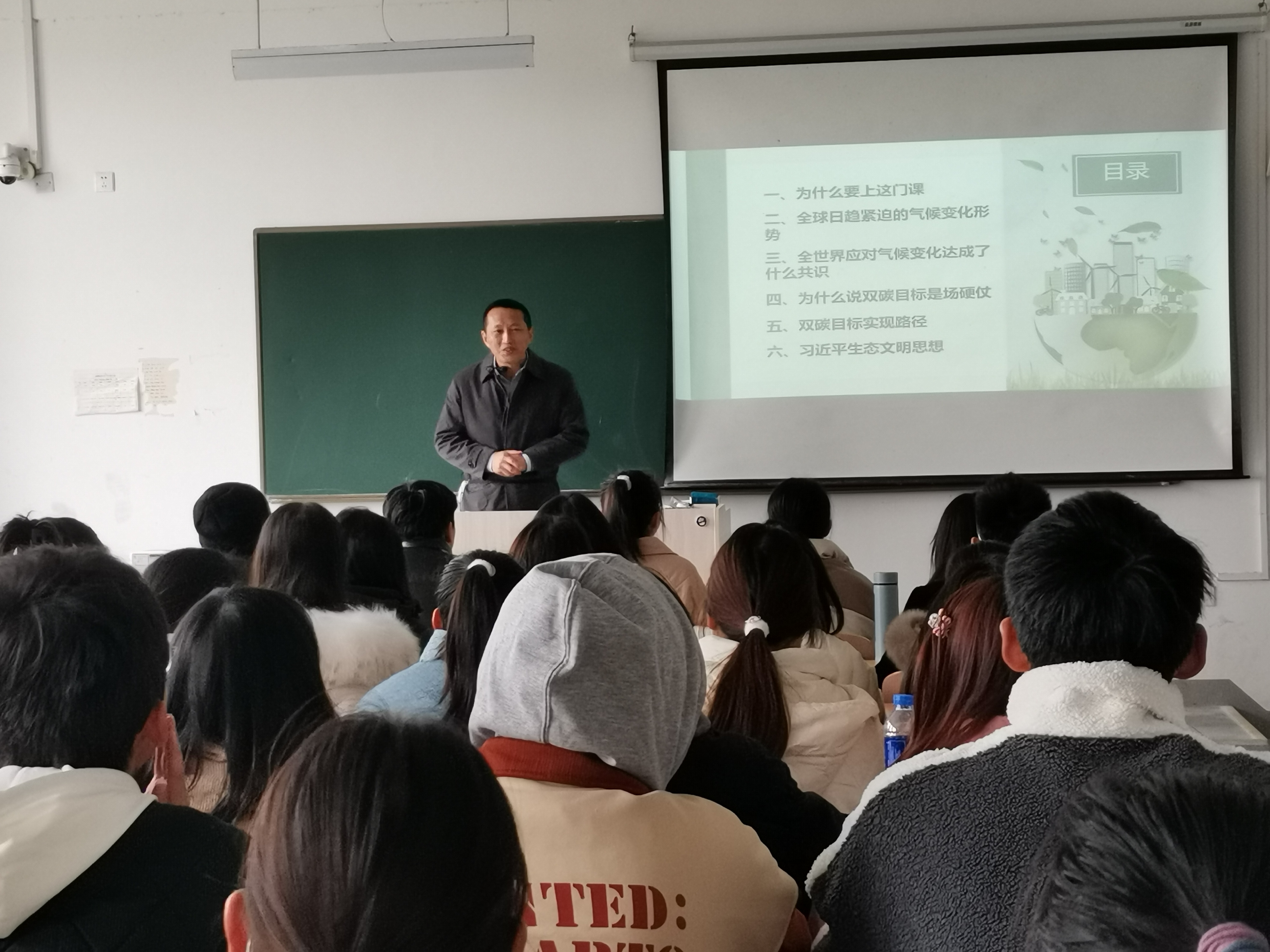 12月1日上午,副校长宇晓锋在滨湖校区南教503教室,向2022级人力资源专业的同学们宣讲以《深入学习宣传贯彻习近平生态文明思想——打好实现碳达峰碳中和这场硬仗》为题的思政课,他从专题的重要意义、全球日益紧迫的气候变化形势、全球应对气候变化达成的共识、双碳目标是场硬仗、双碳目标实现路径、习近平生态文明思想的重要意义这六个方面展开。同学们听后,纷纷表示,将把尊重自然、顺应自然、保护自然,作为自己的习惯,成为忠实的生态环境护佑者,将把节约资源落实在平时的行动中去,养成良好的节俭习惯,为打好实现碳达峰碳中和这场硬仗尽力。