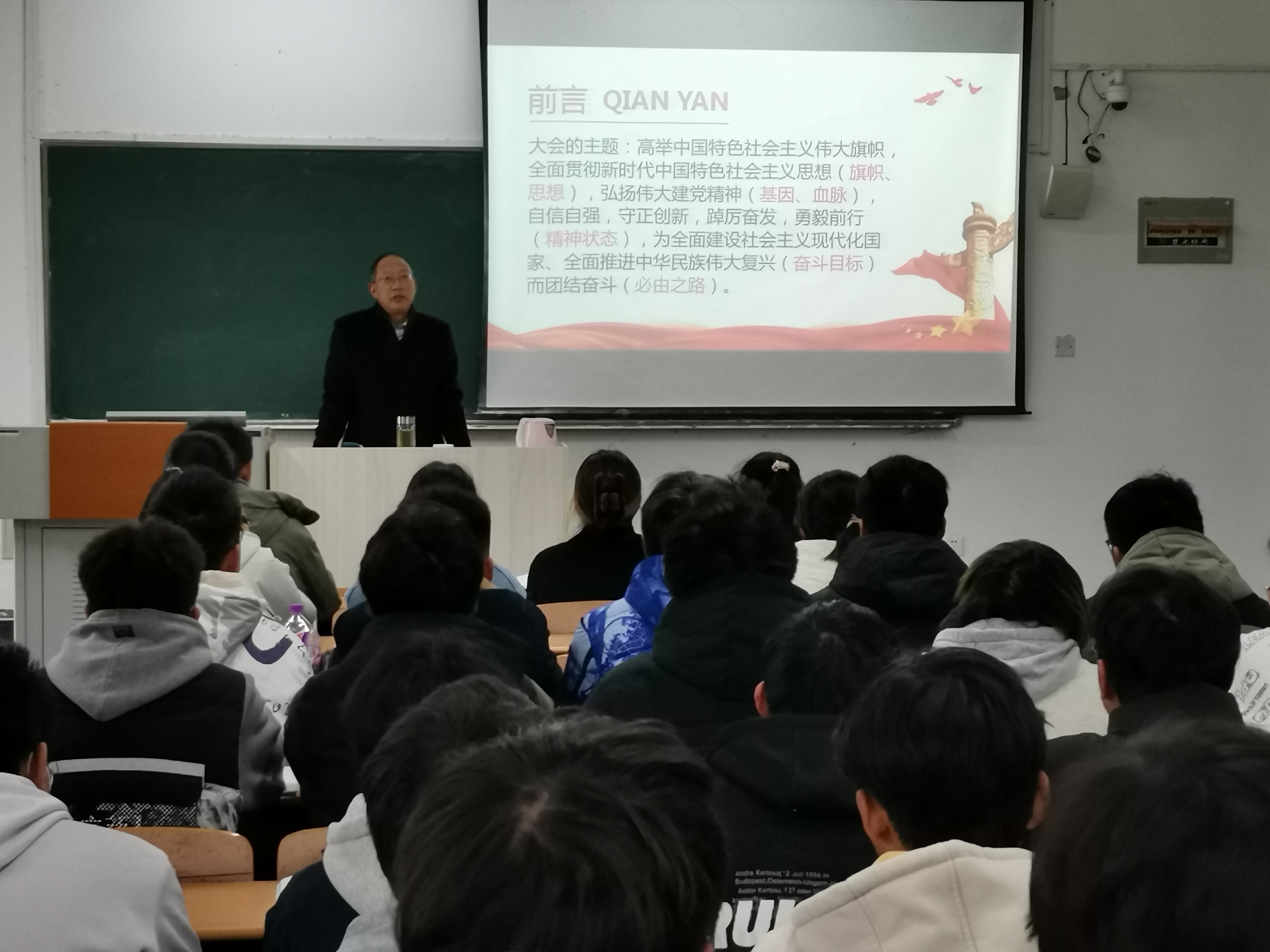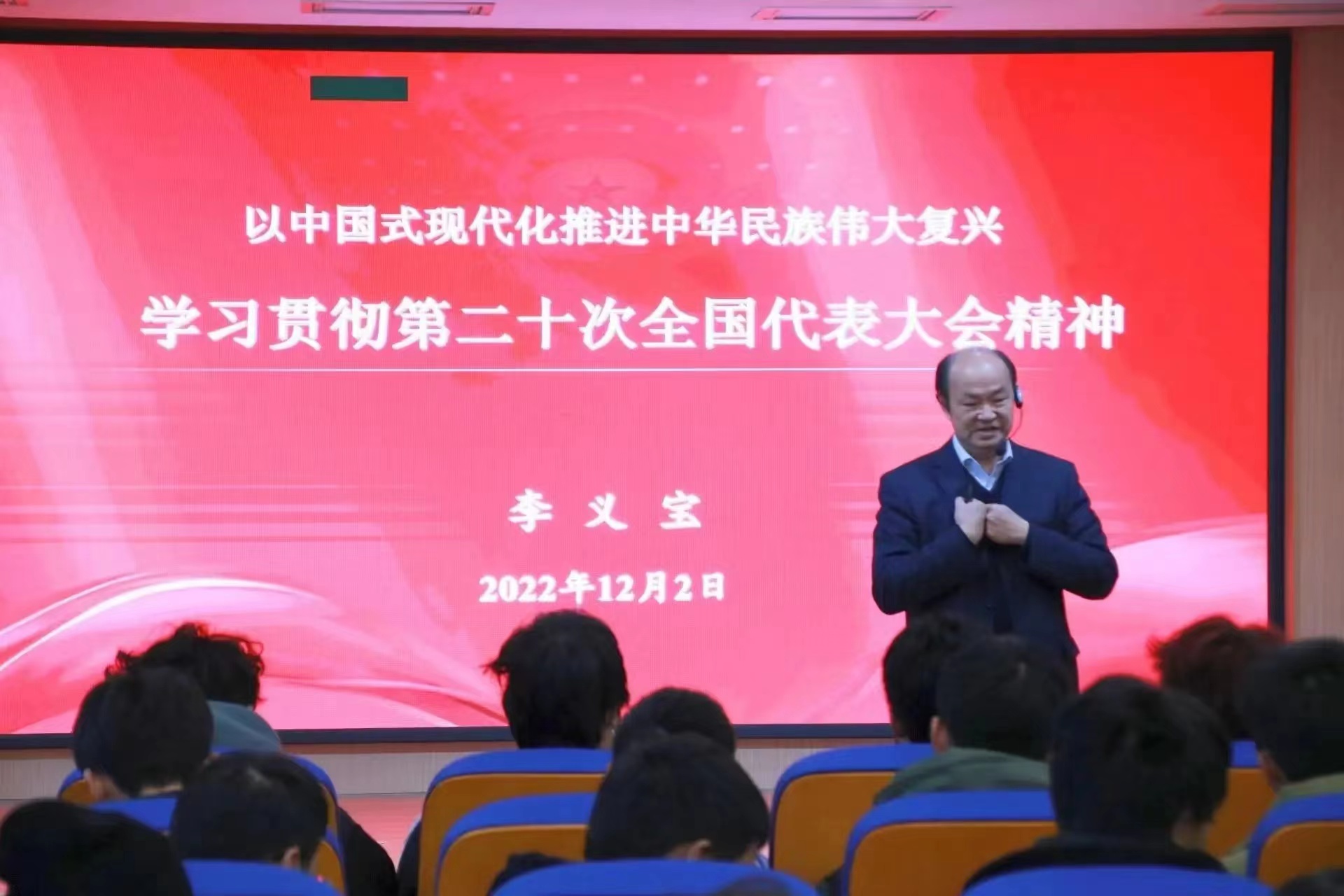 12月2日下午,校纪委书记李义宝到北城校区综训楼405教室向同学们专题讲授党的二十大精神思政课,李义宝以《以中国式现代化推进中华民族伟大复兴——学习领会中国共产党第二十次全国代表大会精神》为题,从大会主题、意义开讲,普及耳熟能详的政治术语:“两个确立”、“四个意识”、“四个自信”、“两个维护”,重点讲清了三个主要问题:第一、新时代中国特色社会主义怎么看;第二、新时代中国特色社会主义怎么干;第三、新时代党的建设新的伟大工程怎么建。重点突出地宣讲了二十大报告的理论意义和实践意义,让同学们感到收获满满,开阔了同学们的视野,增强了同学们以社会主义现代化推进中华民族伟大复兴的坚定信念。