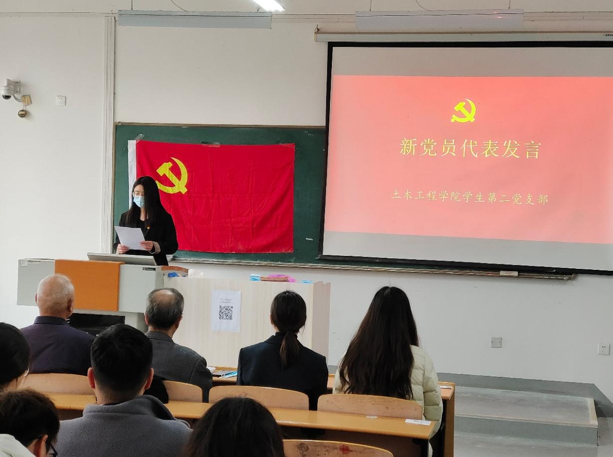 紧接着新党员代表王洁上台发言,她表示作为党支部的一员,在未来的日子要发挥先锋带头作用,时时刻刻想着如何进步,在学习党史上要足够重视不能放松,做学习上的先锋。她承诺今后要更为严格要求自己,做好表率,在学院内部树立典型形象,在生活、学习、工作上发挥党员“传帮带”的先锋模范作用。牢记初心,勿忘誓言,无论在生活中还是在工作上都做到相信党、服从党、服务党,时刻以一个党员的标准严格要求自己,提高自己的思想觉悟,戒骄戒躁谨言慎行,积极向党组织靠拢,努力为党支部的基层建设添砖加瓦。