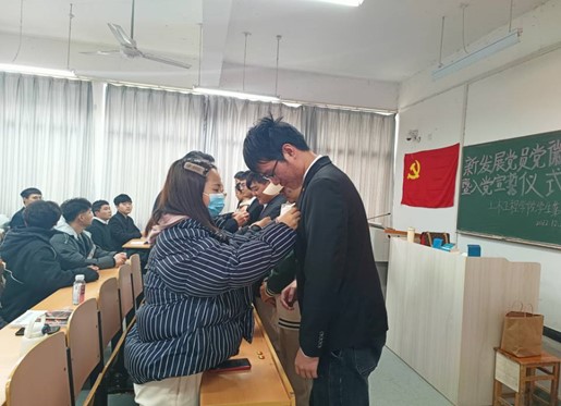 12月8日下午,土木工程学院学生第一党支部在南教102教室为新发展党员隆重举行党徽佩戴暨入党宣誓仪式。参加本次会议的领导嘉宾有校党委委员、副校长马建国,校组织部副部长、人事处副处长金凤;本支部纪检委员何诗凤同志;本支部宣传委员王仟喜同志;本支部辅导员江佳庆同志和程海苗同志。