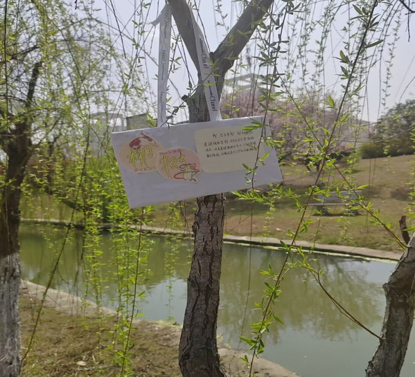 同学们用一双灵活的手和一支画笔勾勒出植物的样子,别具一格的排版可以看出制作者的用心。樱花名片,名牌上的樱花美丽纯洁,花瓣中间的饱满的花蕊像一个害羞的小姑娘。还有这棵柳树,校园的猫咪们有的慵懒地“躺在”柳树上晒着春日的暖阳;有的在柳树旁,春风拂动的柳条像逗猫棒一样引得猫咪活蹦乱跳。