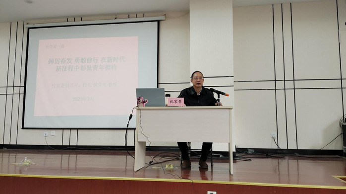 本网讯:为深入学习贯彻党的二十大精神,3月16日下午,校长祝家贵围绕“踔厉奋发 勇毅前行 在新时代新征程中彰显青年担当”主题为同学们开讲新学期第一堂思政课。