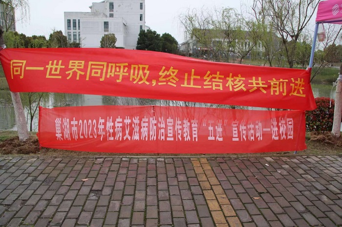 认识结核,携手防艾。巢湖市疾控中心、校团委以及校医务室在食堂门口举办了肺结核、艾滋病的宣传活动。活动现场,志愿者们通过悬挂标语横幅,向过往的同学们发放肺结核防治知识宣传手册,引导同学们在签名墙上签名,号召大家共同预防结核病的流行。巢湖疾控中心和校医务室人员为现场的同学们详细地讲解了艾滋病的传播感染症状、传播途径、治疗原则、预防措施,呼吁大家要建立文明健康的生活方式,并强调要正视、关注、预防重点传染病,有效控制艾滋病、肺结核病的流行蔓延,做到携手预防结核、遏制艾滋。