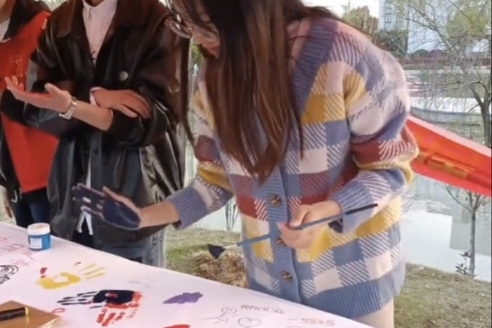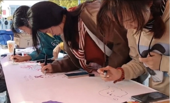 活动现场,百米画卷一字摆开,同学们泼墨写意,从打稿,上色,再到精修,通过线条的勾勒、色彩的渲染,精心绘制出了自己的防艾抗艾心声。此外,其他同学也在画卷上写下了对艾滋病患者的祝福并按上手掌印,以此来表明自己用爱去关怀温暖艾滋病患者的决心。随后,志愿者们耐心的向现场的同学们讲解艾滋病的症状、传播途径及危害等知识,号召大家成为艾滋病防控的践行者和艾滋病知识的宣传者。活动期间,还有部分专业老师莅临现场指导,并对此次活动的新颖性给予肯定。