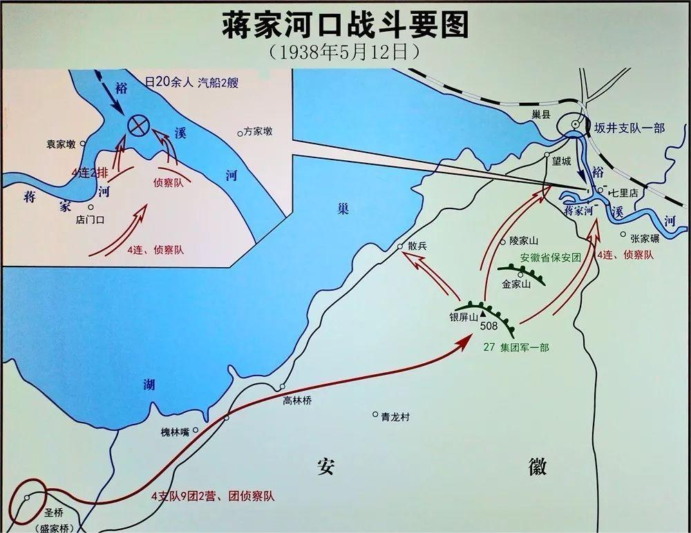 1938年春,日军侵占安徽省滁县、蚌埠、巢县等地。新四军第4支队从鄂豫皖边东进皖中敌后,于4月开展游击战争。第4支队第9团获悉,日军巢县守备队多次乘船至巢县东南蒋家河口一带抢掠肆扰,第4支队第9团政治委员高志荣率领团部侦察队和第2营第4连在蒋家河口西岸设伏,伺机歼灭日军。5月12日8时许,日军一部乘船驶近蒋家河口,第9团伏击部队乘日军下船登岸之际,凭借河岸堤埂居高临下,以突然和密集火力予以迎头痛击。经过20分钟激战,击毙日军20余人,自己无一伤亡。