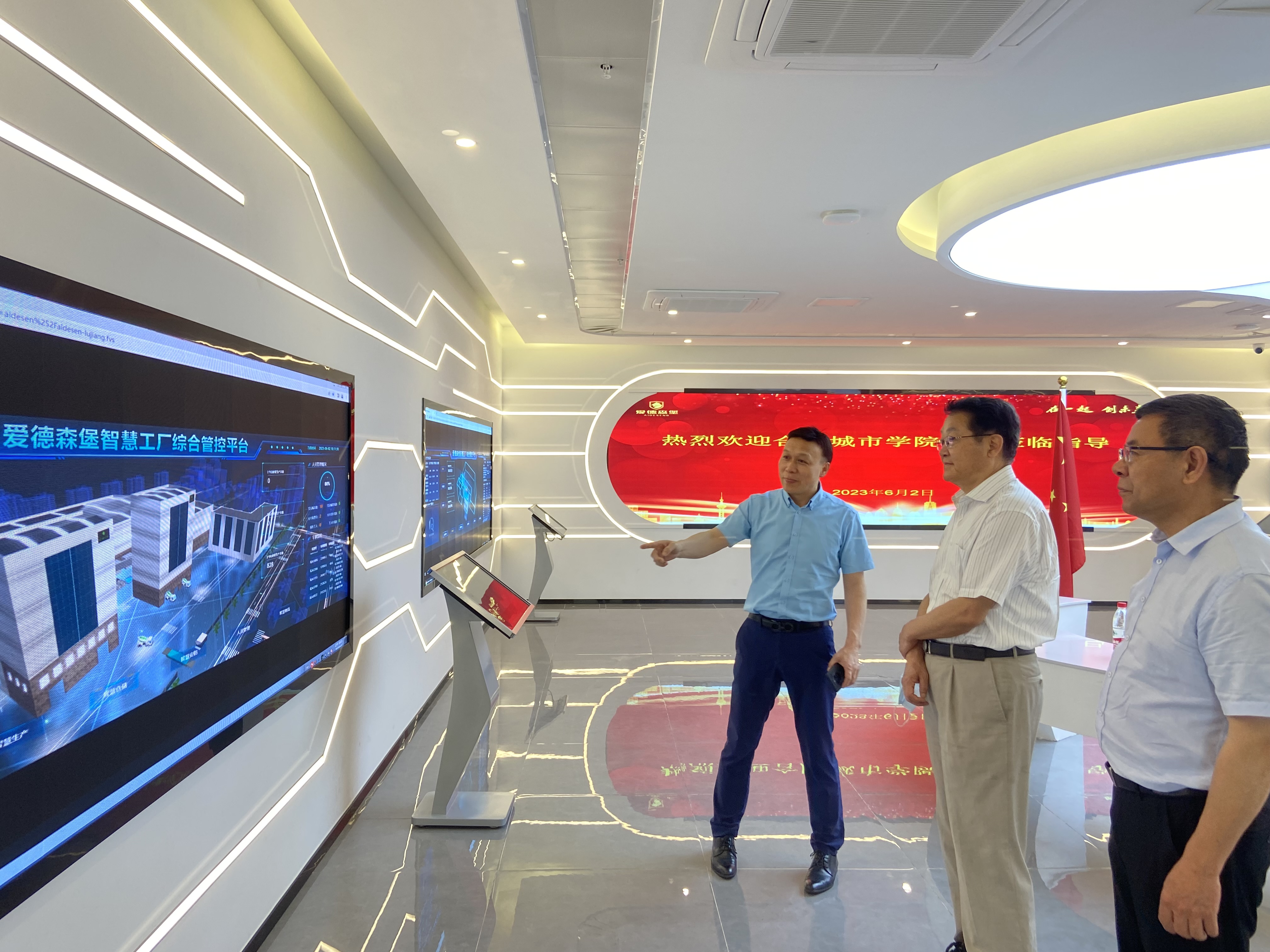 6月2日上午,马建国一行首先到达爱德森堡新材料有限公司参观交流。集团公司董事长黎生军,副总经理黎海峰及有关部门负责人盛情接待。调研团先实地参观公司多功能智慧指挥中心、生产中控室和物流调度中心室等厂区实貌,浏览了智慧工厂综合管控平台及三维模型图,黎生军向大家介绍了现代化示范性智慧工厂“物联网+服务+监管”的全新模式。