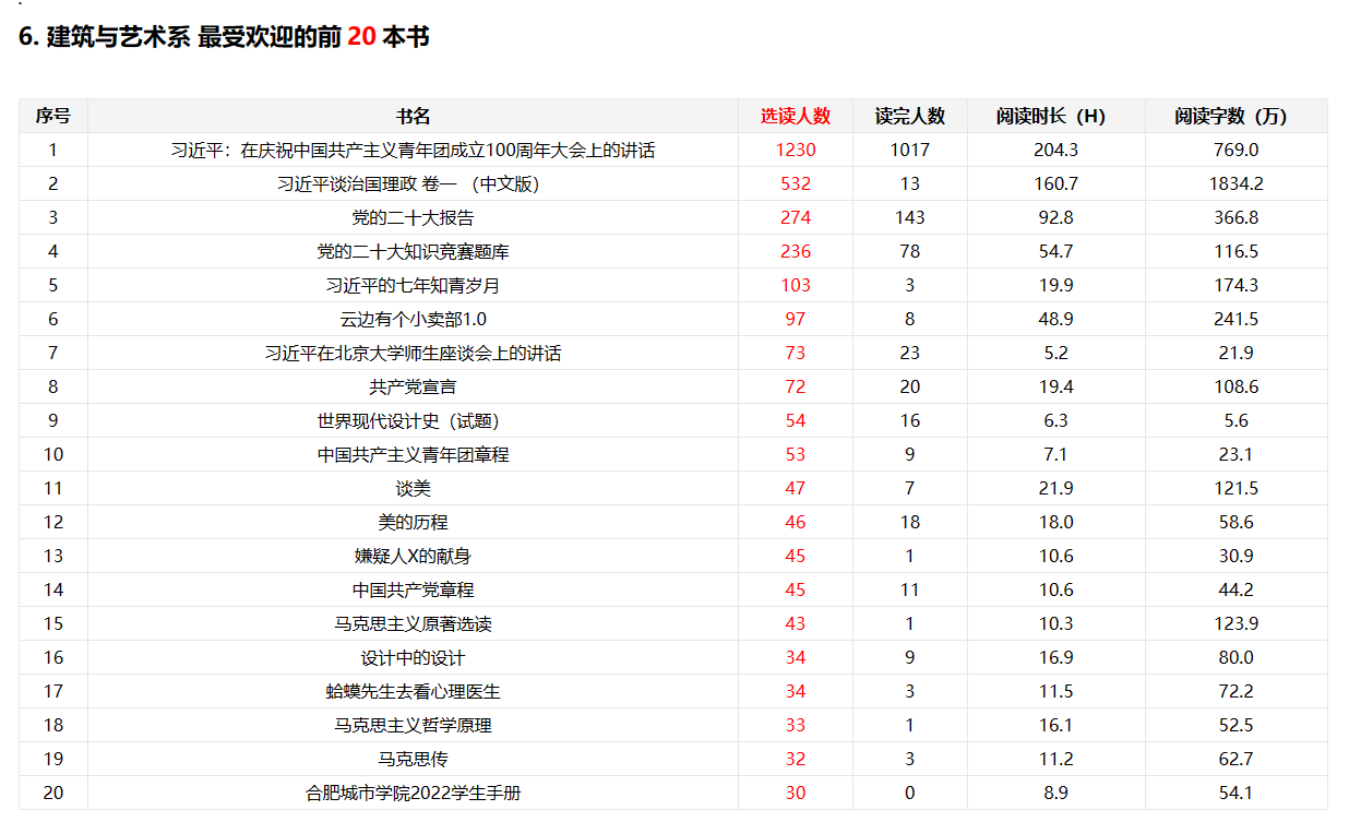 本次活动是学院将荫桐读书与学生活动相结合的第二次尝试,活动分为线上阅读和趣味竞跑两个部分。在赛前一周时间内,学院动员学生报名并使用“好策”app阅读指定书目,完成主题教育学习。其中《习近平:在庆祝中国共产主义青年团成立100周年大会上的讲话》、《习近平谈治国理政 卷一 (中文版)》、《党的二十大报告》等书受到了同学们的广泛阅读和学习,从而进一步推动了党的二十大精神在建筑与艺术学院落地生根。