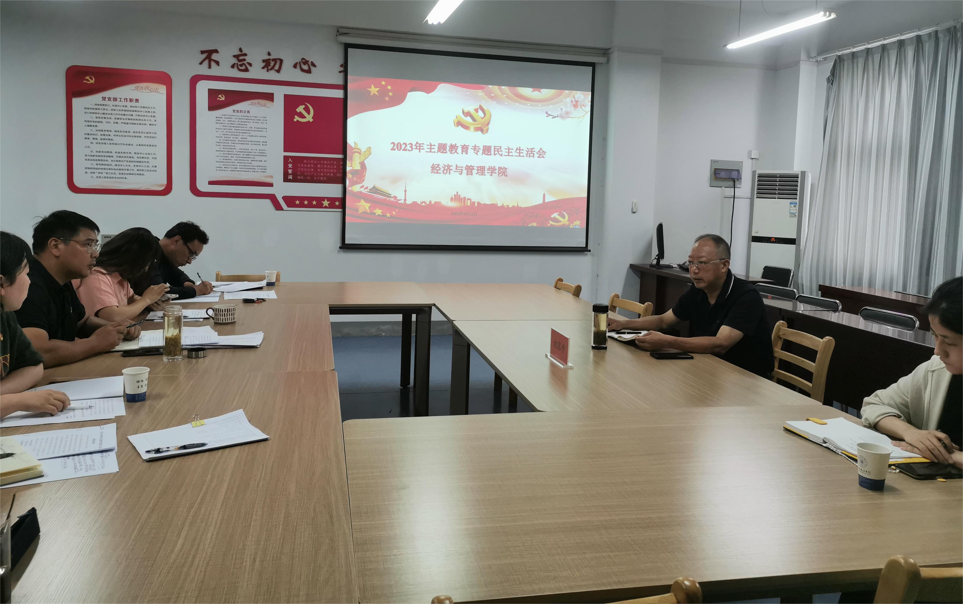 9月12日下午,经济与管理学院学习贯彻习近平新时代中国特色社会主义思想主题教育专题民主生活会在实验楼北503召开,党委副书记、校长祝家贵到会指导。学院党总支班子成员参加会议,学院中层非党员干部列席会议。