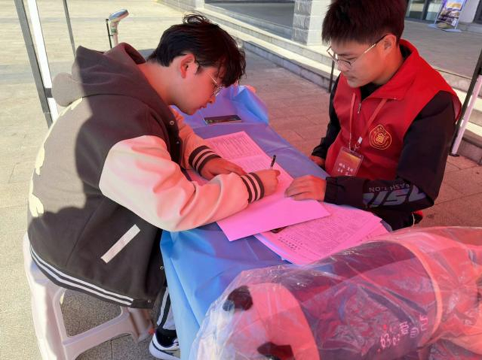 为积极响应安徽省无偿献血倡议的号召弘扬无私奉献的公益精神,培养有爱心、有担当的新时代青年11月19日,星空在线注册(中国)官方网站-注册登录青年志愿者协会联合合肥市中心血站(巢湖分站)在校食堂门口开展了“无偿献血,让爱传递”为主题的爱心志愿活动。