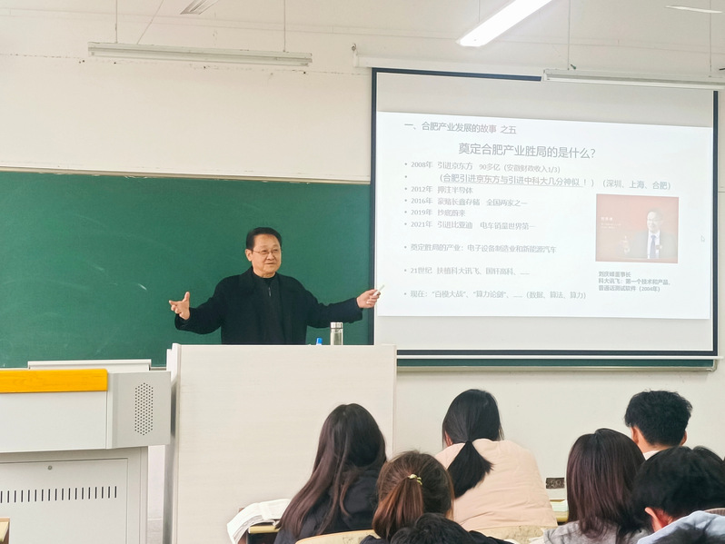 12月12日上午,副校长马建国以《大力推进现代产业体系建设——以合肥和安徽为例》为题,在东教305教室为2023级工业设计专业学生讲授思政课。马建国从“合肥产业发展的故事”“习近平总书记的亲切关怀”“合肥如今的发展”“安徽未来的发展”四个方面进行讲授,解读现代化产业体系建设的深刻意蕴。马建国用“合肥为什么能成为安徽的省会城市”“合肥成为省会后如何填补工业空白”“合肥成为‘制造业强市’的第一个产业”“合肥为什么拥有中国科技大学”“奠定合肥产业的胜局”五个生动有趣的故事,详细介绍了合肥的产业发展之路,生动诠释了合肥产业发展筚路蓝缕的创业历程。这些故事引人入胜,同学们听得津津有味,在学习历史的同时明确了产业发展的重要意义。