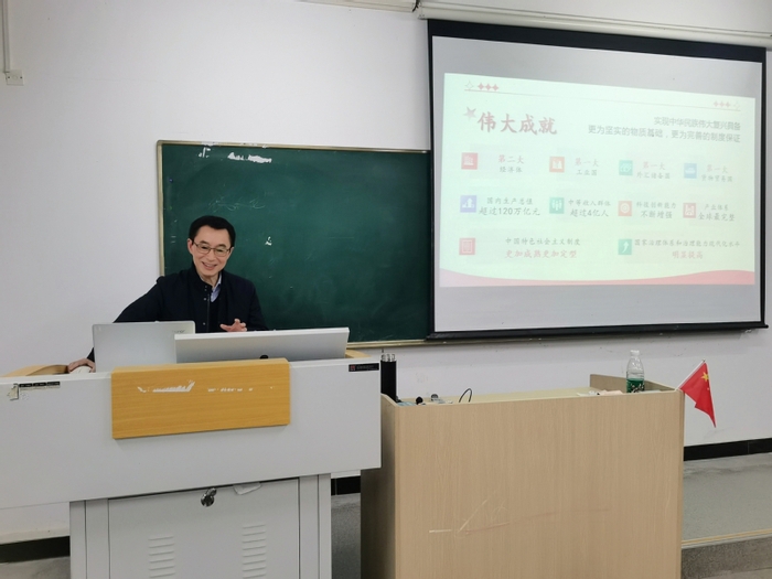 成祖德结合自身的学习经历讲述中国的伟大成就,深入浅出、内涵丰富、阐述透彻的授课,引发了全体同学的强烈共鸣和深刻思考。课程结束时,全场响起了热烈的掌声,在场同学们纷纷表示,进一步加深了对马克思主义中国化时代化历程中先后形成的三次理论飞跃的思想认识。今后将继续增强政治自觉、思想自觉、行动自觉,不断学习中华优秀传统文化,领悟并运用习近平新时代中国特色社会主义思想的世界观和方法论,让马克思主义中国化时代化最新成果闪耀出更加璀璨的真理光芒。