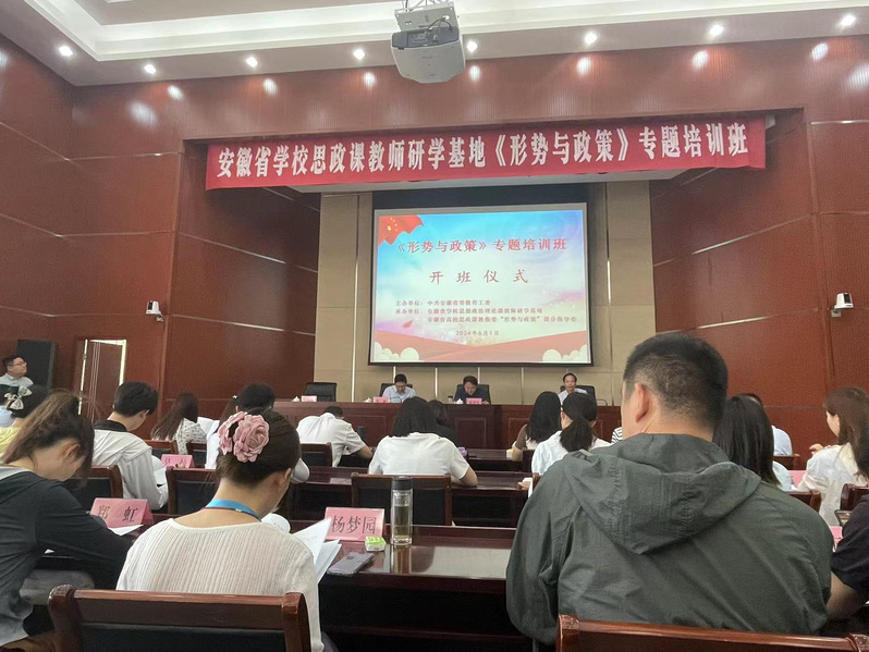 安徽财经大学马克思主义学院院长张斌、安徽农业大学马克思主义学院院长黄洪雷、安徽金寨干部学院院委委员陈绍先在开班仪式上分别对此次《形势与政策》专题培训班的目的、意义、安排和纪律做了详细的说明,并对参与培训的思政教师提出期待。此次培训班顺利开班。
