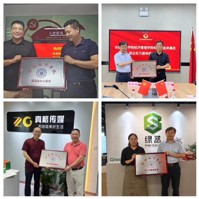 在访企过程中,曹泽向企业介绍了学院发展历史、办学特色、专业特色等情况,企业代表就企业概况、发展历程、涉及的产业类型、经营方向以及岗位需求在会上做了介绍。曹泽、周世敏、范海洲分别与安徽绿丞科技服务有限公司、合肥优曼人力资源咨询有限公司、安徽金泉集团和安徽真格传媒科技有限公司签订校企合作协议,授牌并合影留念。