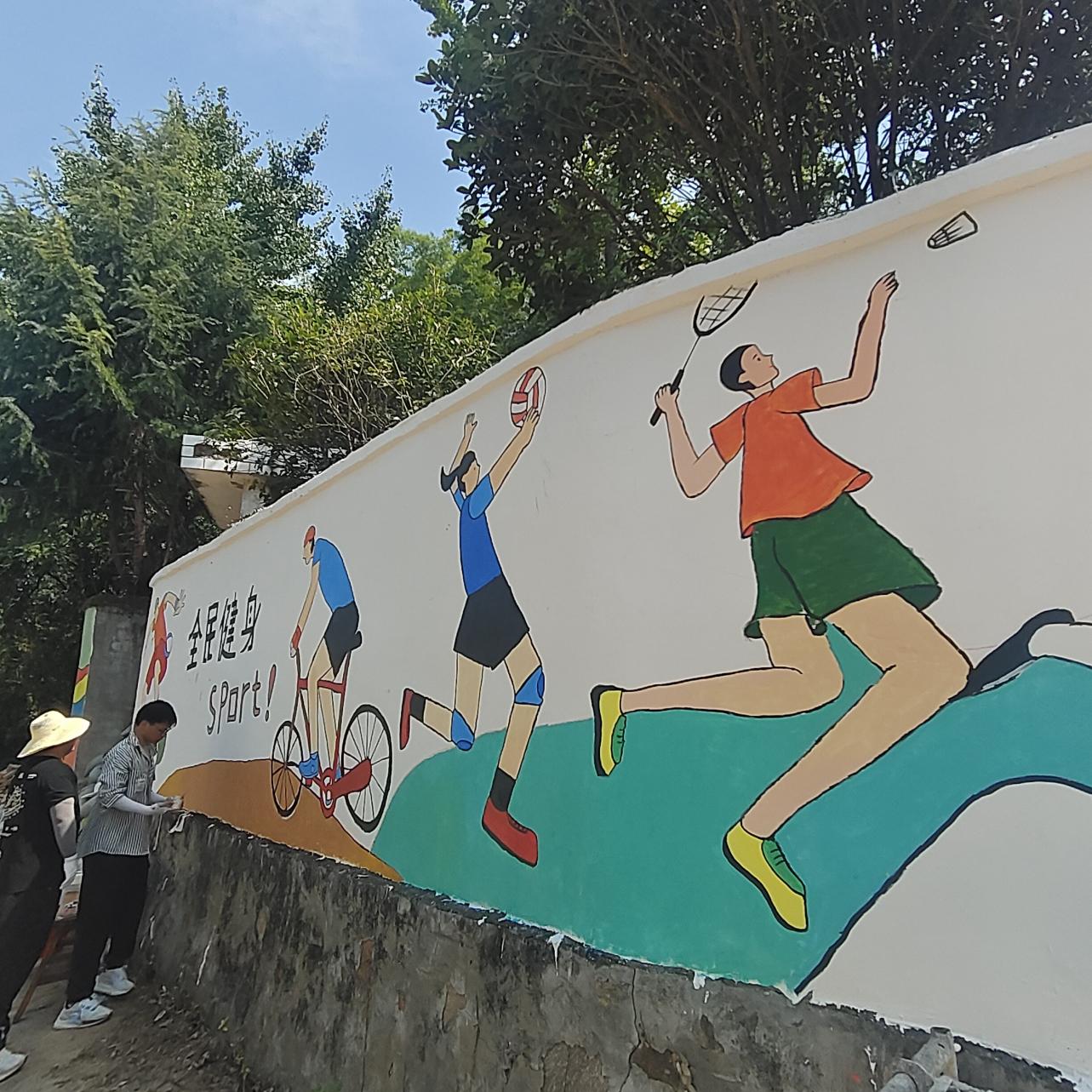 活动伊始,团队成员深入乡村,与当地村民亲切交流,了解乡村的历史文化、民俗风情以及发展愿景,为墙绘创作汲取灵感。经过精心策划和设计,一幅幅主题鲜明、富有创意的墙绘作品逐渐在村庄的墙壁上展现。在彩绘过程中,青年志愿者们在炎热的太阳下,尽情发挥自己艺术特长,以丙烯、画笔为绘画材料,通过打底、勾线、上色,将运动项目、二十四孝图等内容栩栩如生展现出来,向村民倡导着文明健康和积极向上的价值观念。青年志愿者们积极与团委,村民进行沟通,听取团委意见,设计绘画图纸,对每一面墙进行测量和规划,耐心为村民们讲解书画知识和技巧。