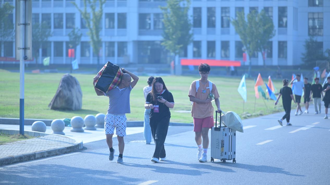 校园里,红幅高悬、彩旗飘飘,各类迎新标语、宣传版画鲜亮醒目,营造出热烈的迎新氛围。各学院的迎新报到场地整齐有序,迎新工作人员和志愿者早早抵达迎新现场开展准备工作,以饱满的热情迎接来自五湖四海的新同学。