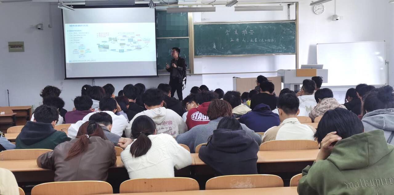 王星通过引调水工程、城乡供水一体化工程等多个成功案例向师生们分享了供水的设计理念和实践方案,他还重点介绍了现代给水工程的行业趋势:技术创新驱动增长、水厂智慧化建设、管网的韧性建设等。同时,王星针对当前给排水专业的发展趋势以及同学们如何规划自己的职业生涯等问题与学生进行讲解与分析,并鼓励在座的学子们要勇于追求梦想、敢于创新实践,不断提升自己的专业素养和综合能力,以适应新时代行业发展的需要。