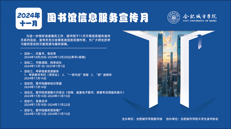为了提升师生的信息素养和阅读能力,了解图书馆的文献资源及有效利用图书馆的基本技能,在校领导的大力支持下,图书馆于11月开展“信息服务宣传月”系列活动。活动涵盖了“你荐书我买单”、“书香满园,阅享成长”、“考研信息资源服务”、“图书馆趣味知识答题”、“图书馆资源推介”等项目。