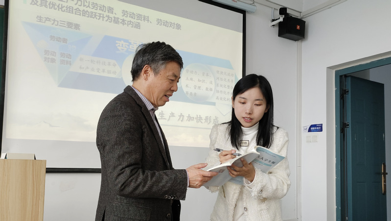 11月13日上午,北城校区,安徽省教指委教授蒋德勤指导《形势与政策》课程教学。马克思主义学院教师耿庆讲解《加快发展新质生产力》一课,围绕事关全局的国之大者,创新质优的质态特征,统筹推进的系统工程三个方面进行授课,课后,蒋德勤针对课堂教学进行指导,提出青年教师在对教材进行充分解读的基础上,应充分挖掘学生感兴趣的话题等建议。
