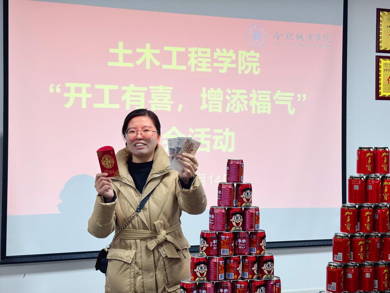 活动以传递祝福、凝聚力量为核心,通过精心设计的环节为教职工带来惊喜与温暖。工会为每位教职工准备了寓意吉祥的红包和饮品:红包内包含两张5元现金,象征“二五”腾飞,寓意新的一年事业顺利、生活美满;现场还特别设置了2个内含20元现金的“2025幸运红包”,增添活动趣味性。饮品则选用“加多宝”与“旺仔牛奶”,分别寓意“健康好运”与“事业兴旺”,传递学院对教职工的关怀与祝福。
