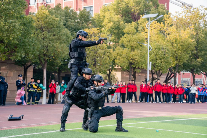 活动伊始,特警队员们带来的战术演练瞬间点燃了全场的热情。他们身着黑色战术服,动作敏捷、配合默契,一招一式尽显专业素养。面对“犯罪分子” 的挑衅,特警队员们迅速做出反应,运用精湛的战术技巧将其成功制服。现场的同学们被这精彩的表演深深吸引,不时爆发出阵阵惊叹和热烈的掌声,仿佛置身于一场紧张刺激的警匪大片之中。