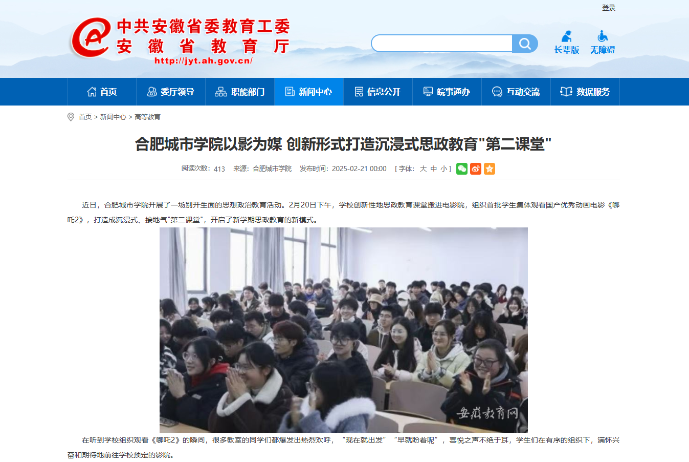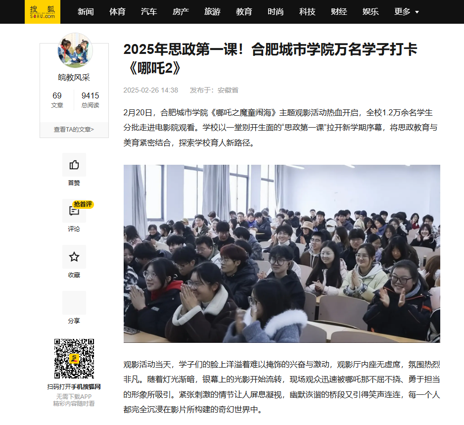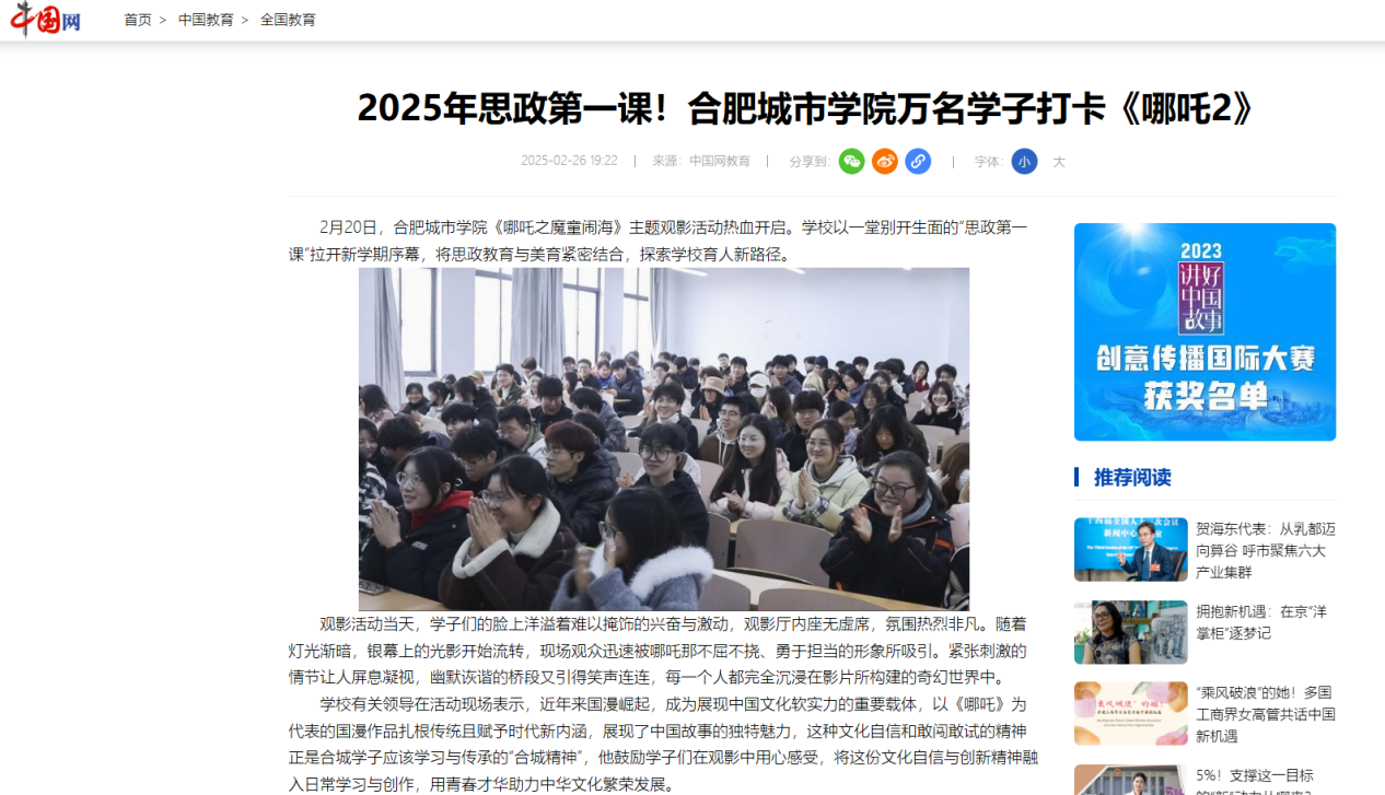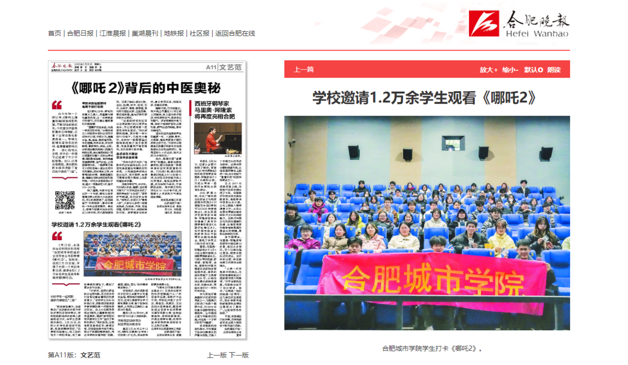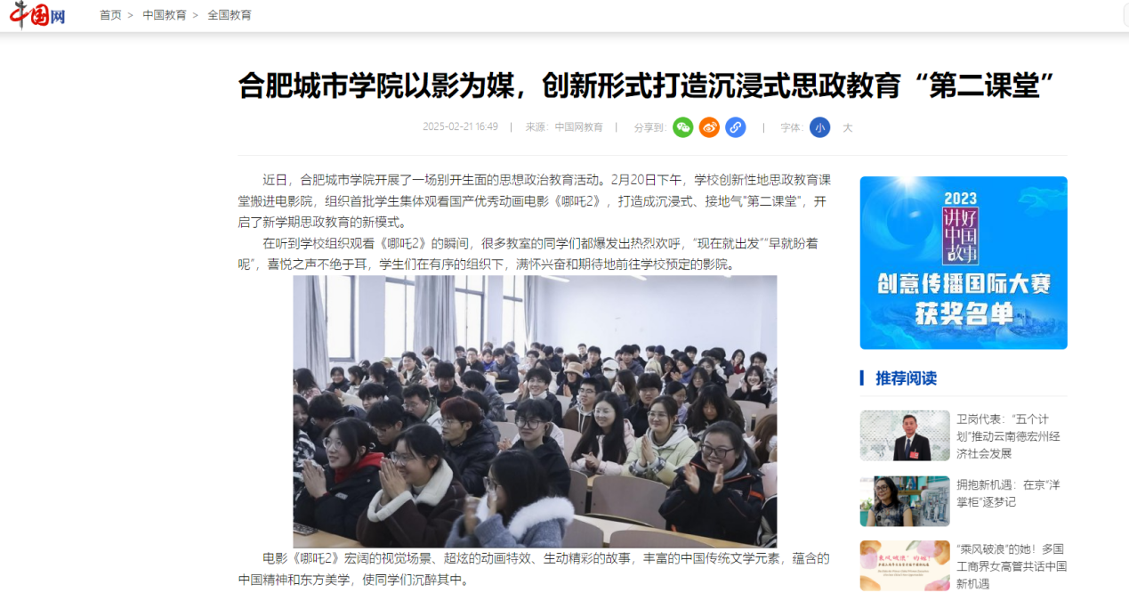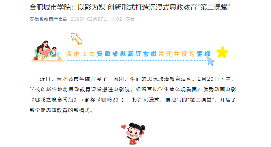 本网讯:近日,我校《哪吒之魔童闹海》主题观影活动先后被中国网、中国教育风采、安徽教育网、安徽省教育厅官微、合肥晚报、搜狐、百度、今日头条等多家主流媒体平台转发,引起社会各界广泛关注。