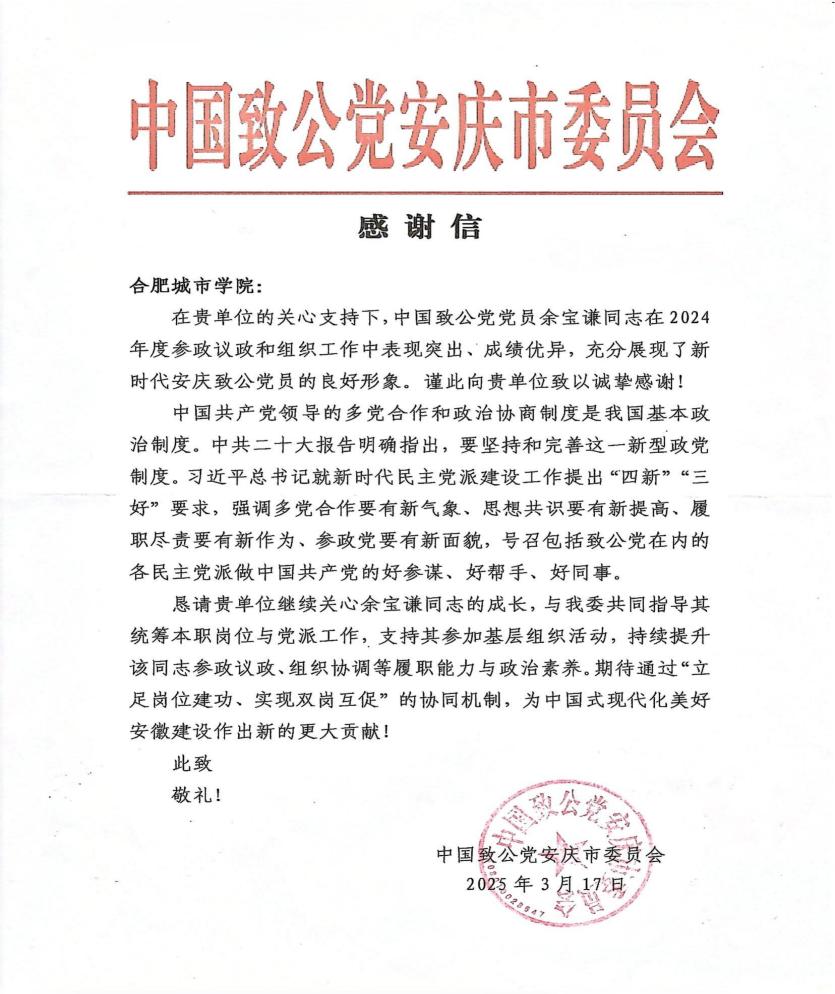 近日,星空在线注册(中国)官方网站-注册登录收到中国致公党安庆市委员会发来的感谢信,信中高度赞扬了星空在线注册(中国)官方网站-注册登录教师、中国致公党党员余宝谦同志在2024年度参政议政和组织工作中的突出表现,并对星空在线注册(中国)官方网站-注册登录给予的支持表示诚挚感谢。