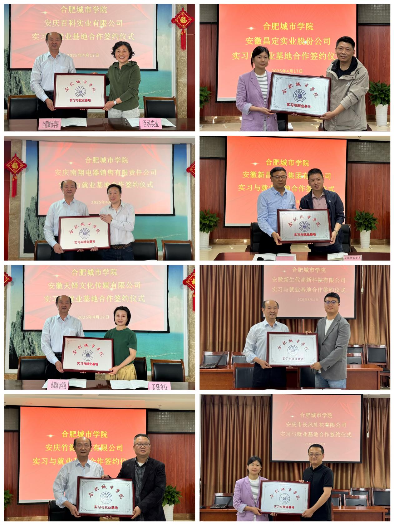 活动中,校方与安庆百科实业有限公司、安庆南翔电器销售有限公司、安徽新昌贸易集团有限公司、安庆竹源科技有限公司、安徽新生代高新科技有限责任公司、安徽天铎文化传媒有限公司、安徽昌定贸易实业股份公司、安庆市长风轧花有限公司等八家单位签订实习与就业基地合作协议,并举行了授牌仪式。